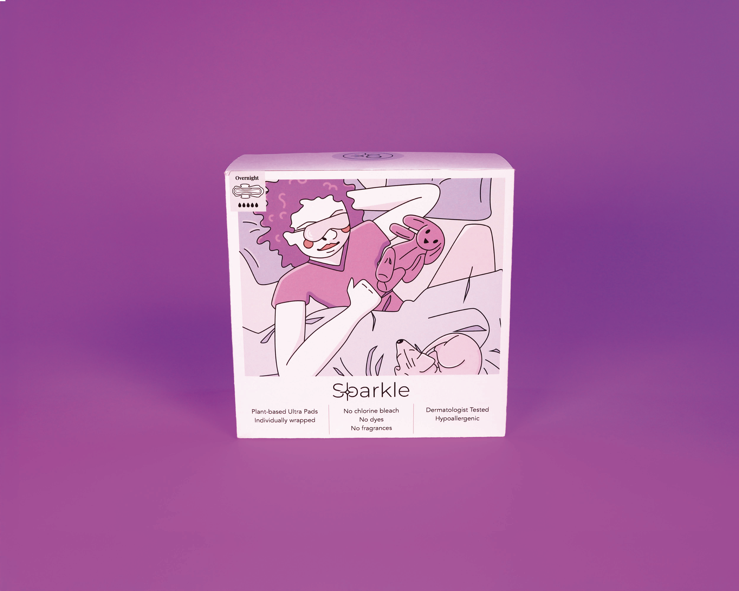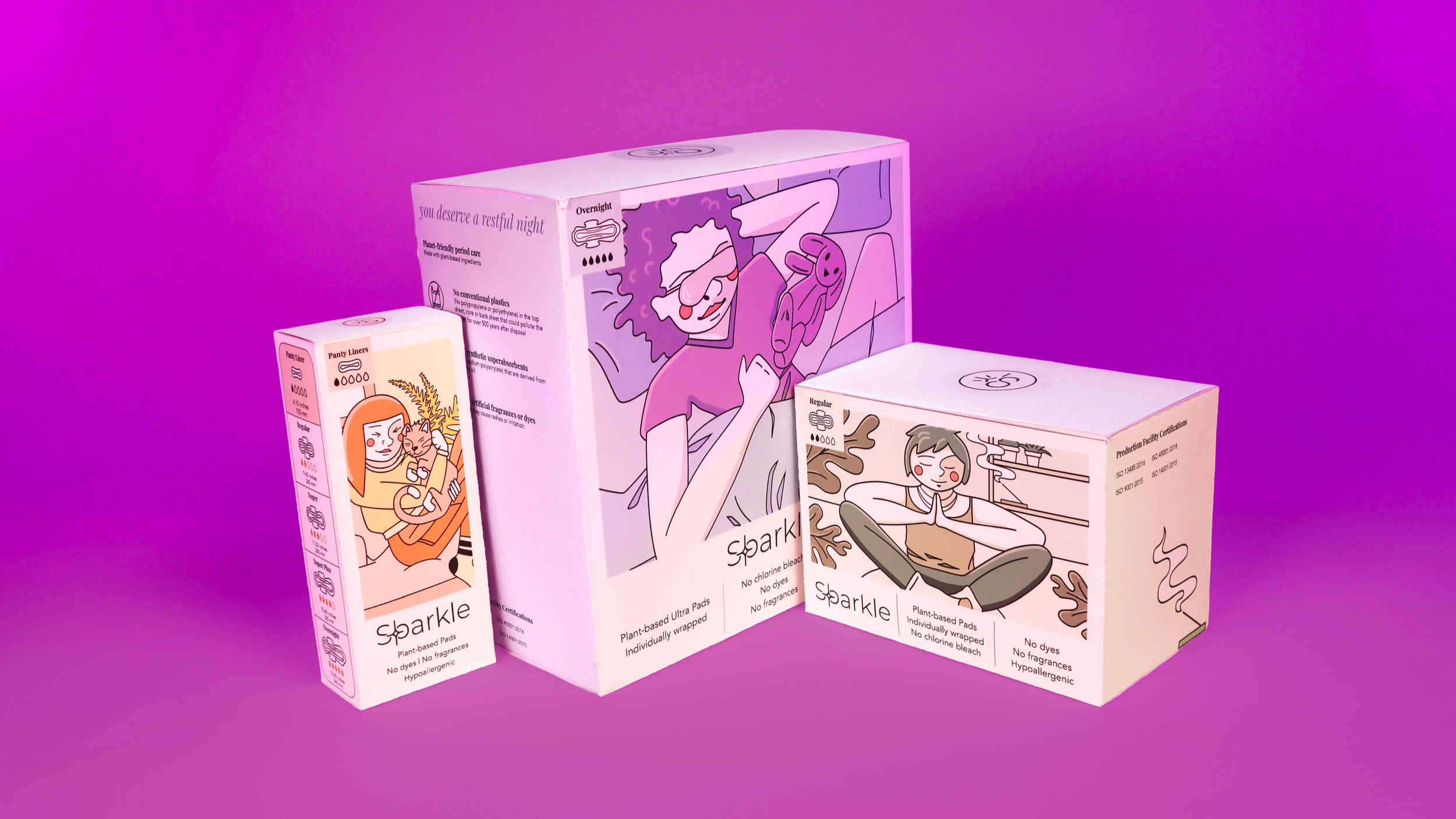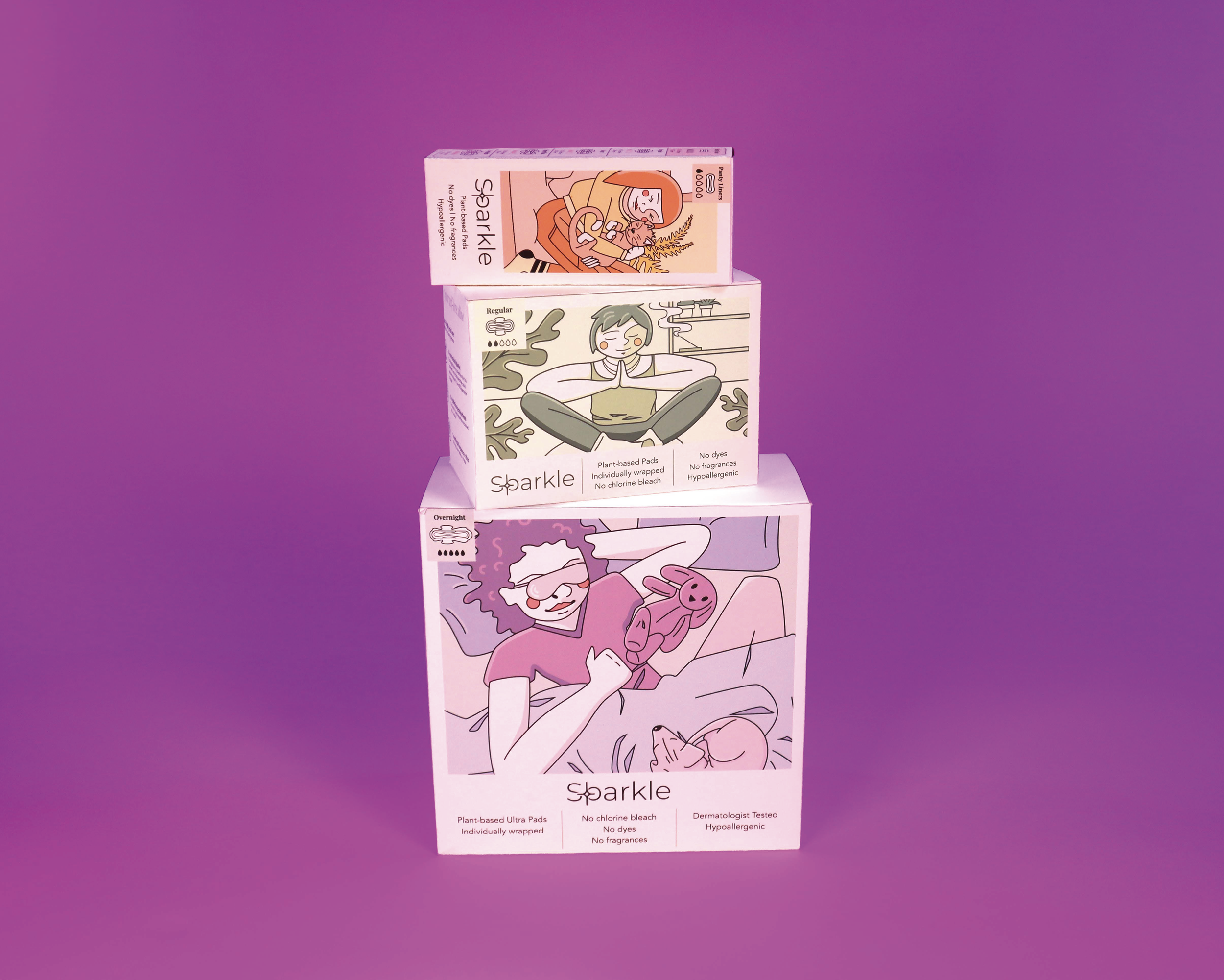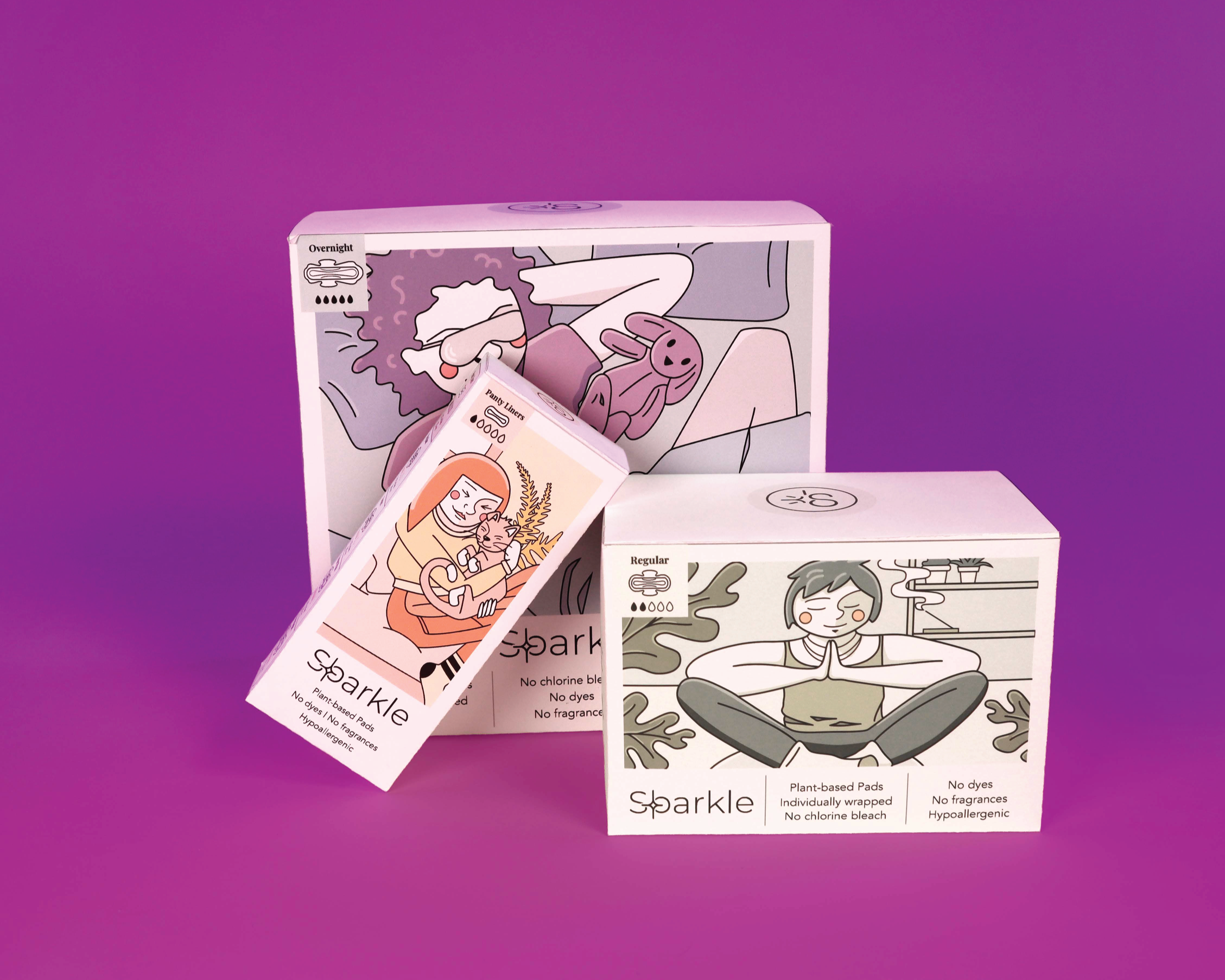 This is a packaging redesign for the menstrual hygiene brand known as Sparkle. Sparkle menstrual pads are plant-based pads that are not made with any conventional plastics (polypropylene and polyethylene), synthetic super absorbents (sodium polyacrylate), artificial fragrances, deodorants, dyes, chlorine bleach, latex, parabens, formaldehyde, dioxins, or chloroform. This means they pair well with sensitive skin, and don’t cause rashes or irritation. Additionally, their products are made with plant-based materials which not only makes them great for our bodies, but great for the earth as well.