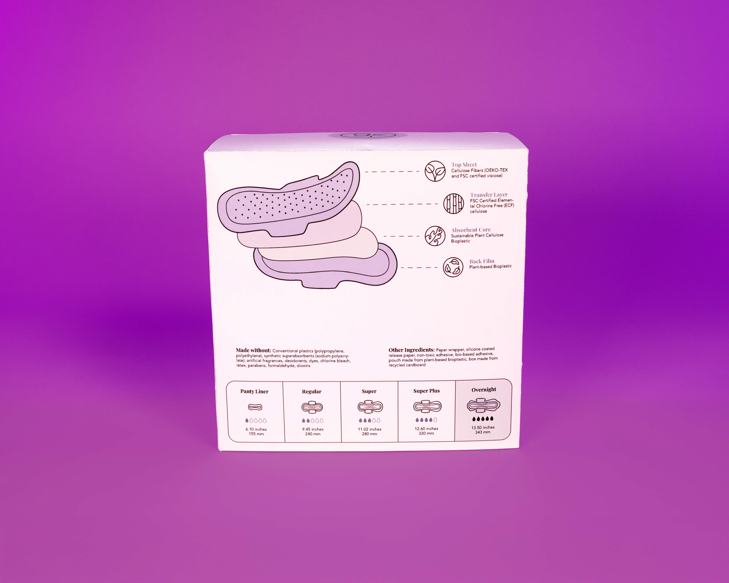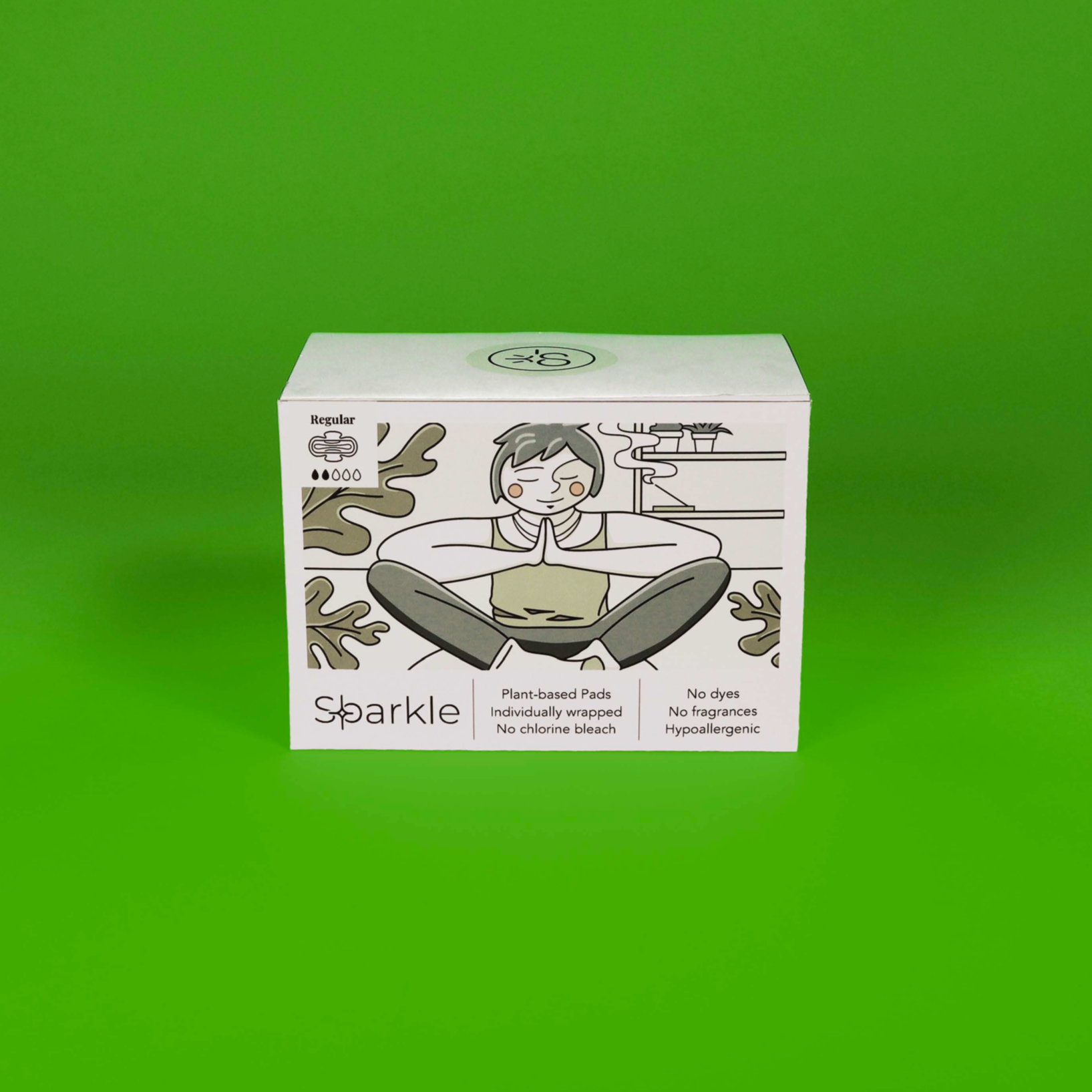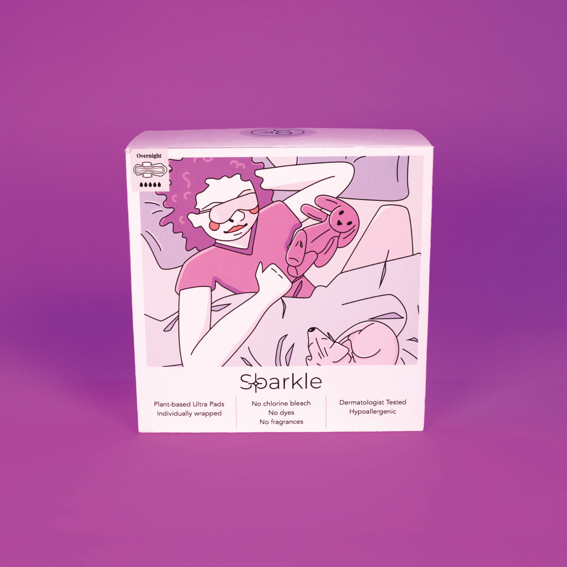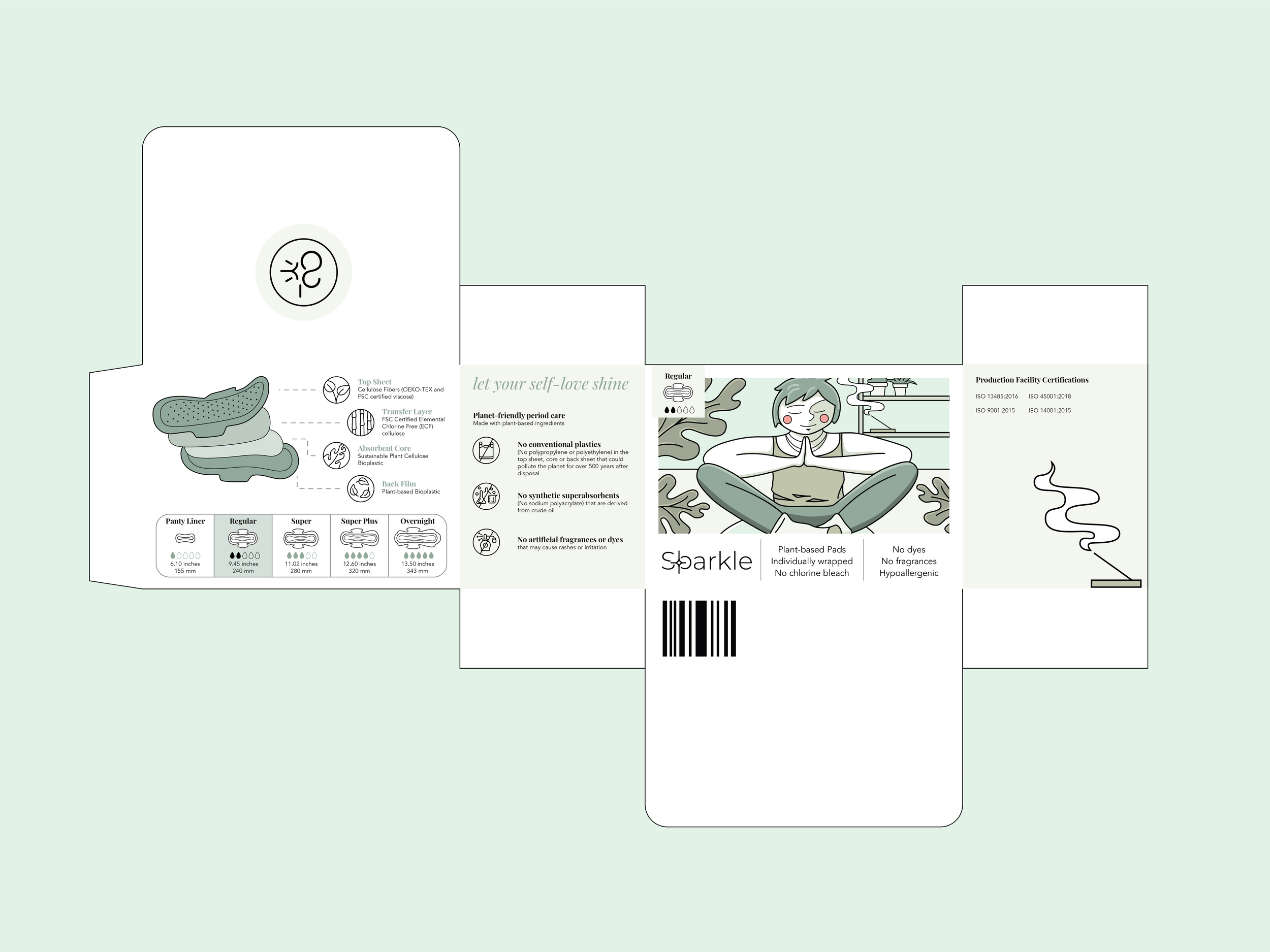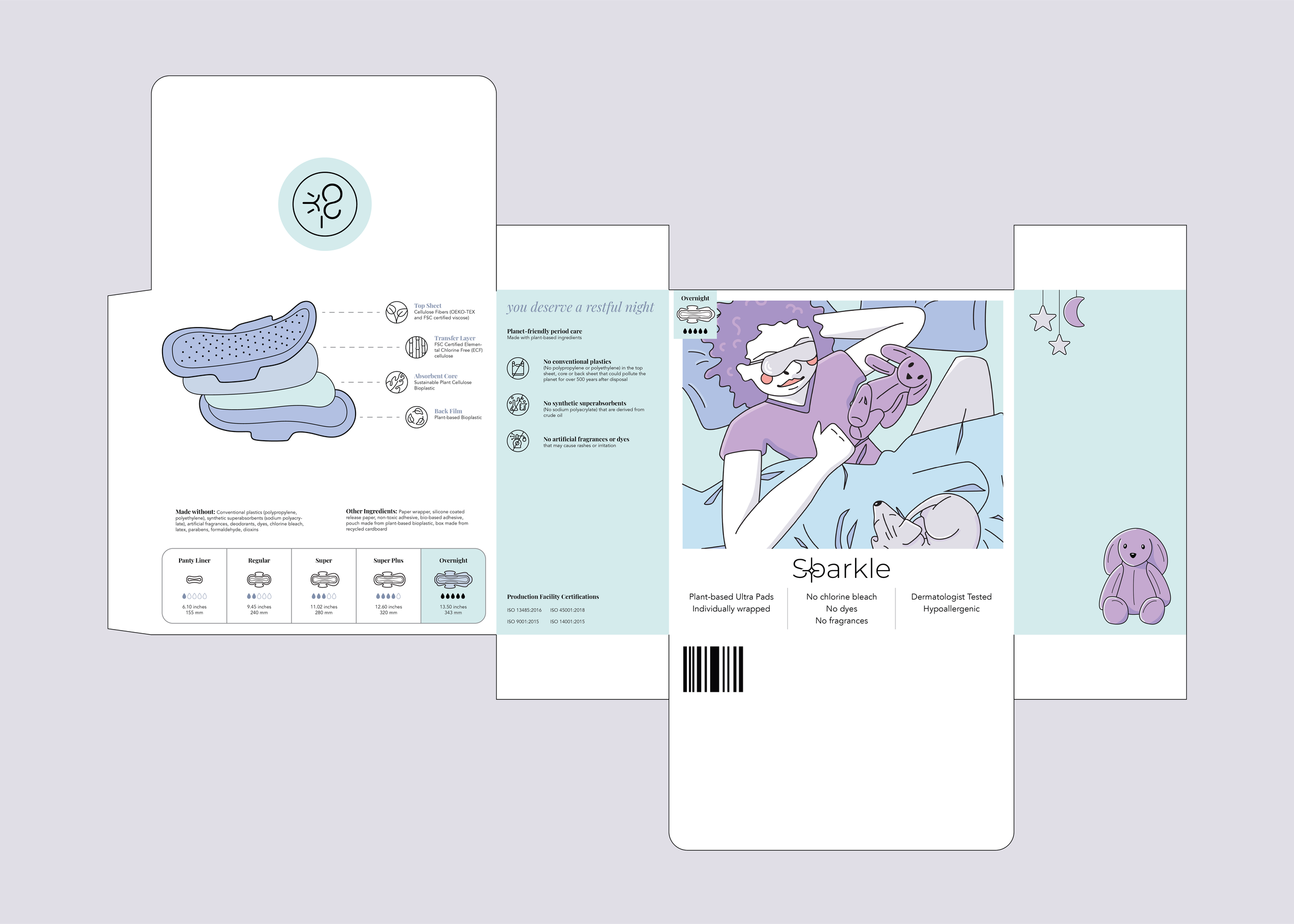 This is a packaging redesign for the menstrual hygiene brand known as Sparkle. Sparkle menstrual pads are plant-based pads that are not made with any conventional plastics (polypropylene and polyethylene), synthetic super absorbents (sodium polyacrylate), artificial fragrances, deodorants, dyes, chlorine bleach, latex, parabens, formaldehyde, dioxins, or chloroform. This means they pair well with sensitive skin, and don’t cause rashes or irritation. Additionally, their products are made with plant-based materials which not only makes them great for our bodies, but great for the earth as well.